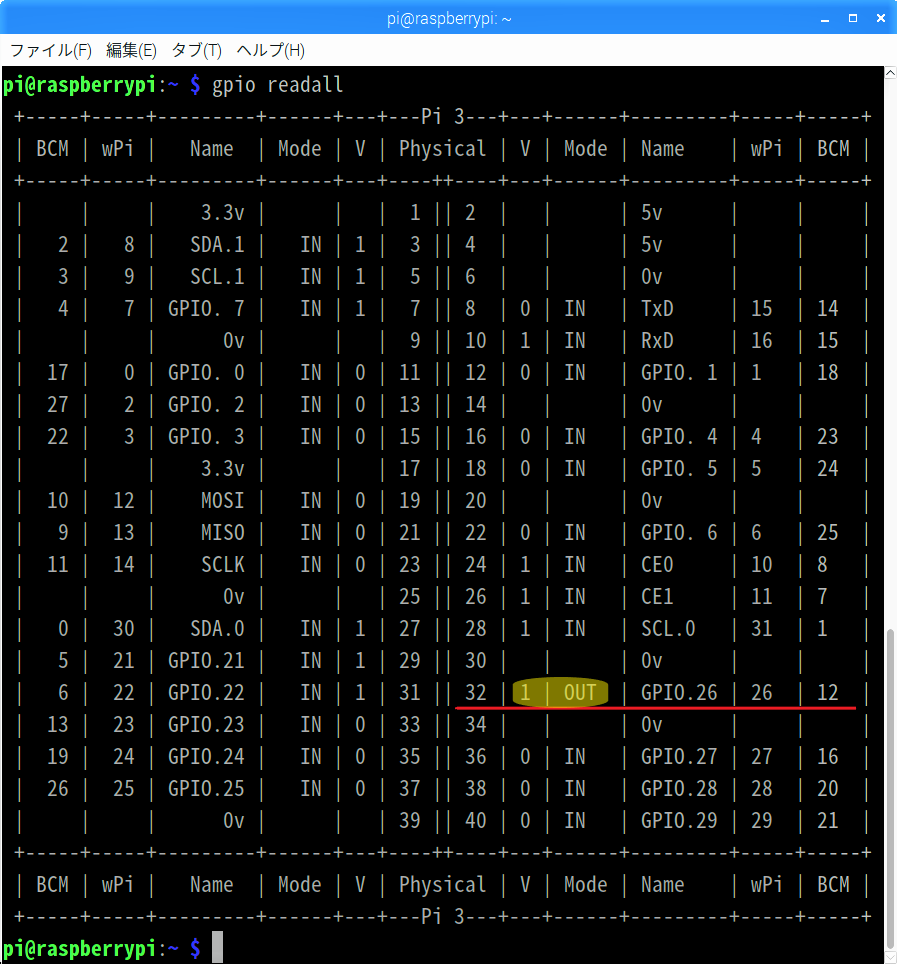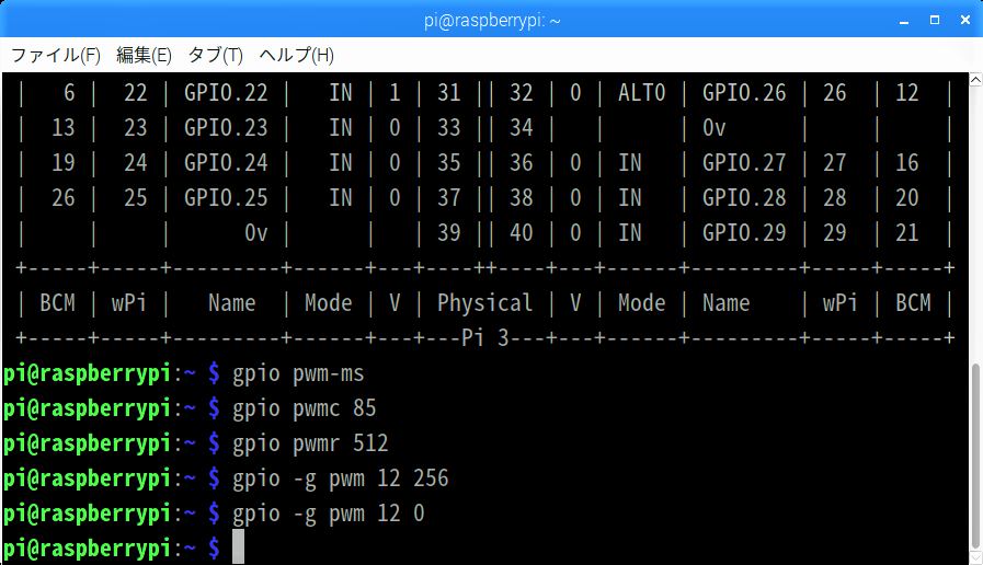 LXTerminalで次のコマンドを実行すると、GPIO12の出力モードがハードウェアPWMに設定されます。
