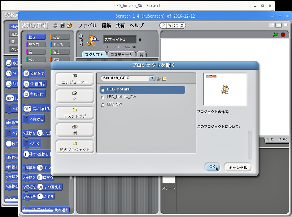 表示されたフォルダから、ベースとするプロジェクトが保存されたフォルダを選択します。今回は、【第5回】で作ったプロジェクト”LED_SW”を保存したフォルダ「Scratch_GPIO」をダブルクリックします。