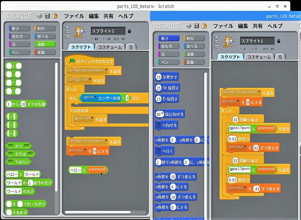 ブロック「 ( ハロー ) と ( pwmout ) 」の”ハロー”をクリックして”gpio17pwm”で上書きします。