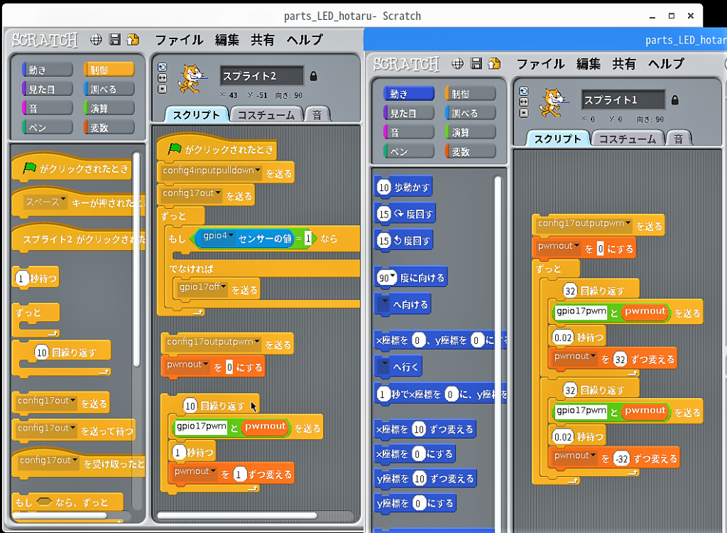 複製したスクリプトの後半でLEDの明るさを下げる為、ブロック「 ( pwmout▼ ) を ( 32 ) ずつ変える」の”32″を”–32″で上書きします。