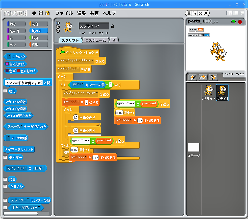 画面右上の「緑の旗」をクリックしてスクリプトが起動中にタクトスイッチを押すと変数モニター「 gpio4センサーの値 (0) 」の”0″が”1″になり、「pwmout (0) 」の”0″が”0から1023″の間で刻々と上下しながらLEDの明滅が始まります。タクトスイッチを押している指を離すとLEDの明滅は停止するのですが、やはり離すタイミングとLEDの消灯のタイミングが合いません。