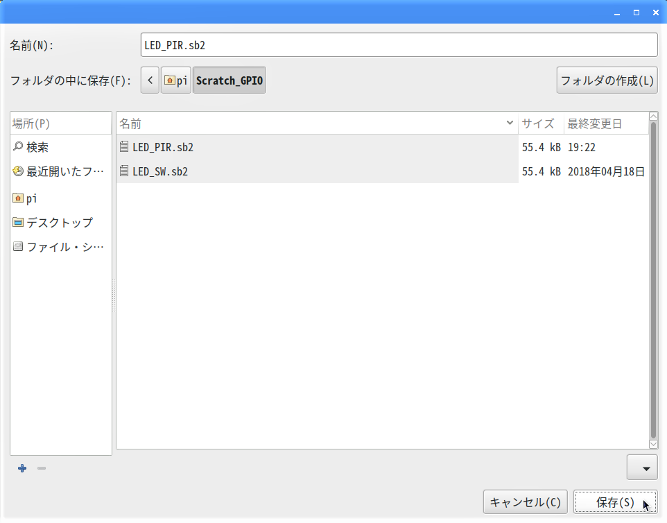項目「名前:」の入力蘭に拡張子”.sb2″はそのままで今回のプロジェクト名を入力し、「保存」ボタンをクリックします。