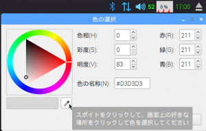 現れた「Pick a Color」ウィンドウで、左下にあるスポイトのアイコンをクリックします。マウスカーソルがスポイトに変わるので、画面上の好きな色の位置をクリックすると、クリックしたところの色が「Pick a Color」のスポイトアイコンの右に表示されます。その色でよければ、「OK」ボタンをクリックします。