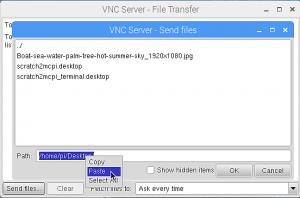 「VNC Server – Send files」画面の「Path:」入力欄を全選択して右クリックから「Paste」を選択します。
