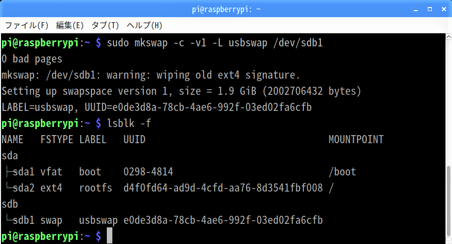 コマンド”mkswap“で、USBメモリー”sdb1″に、ラベル名”usbswap”として、swap領域を準備します。