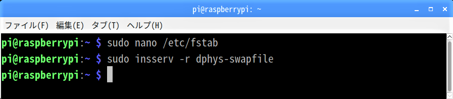 インストールした”insserv“で、Raspbian起動時にswap領域管理サービス”dphys-swapfile”が自動実行されるのを止めます。