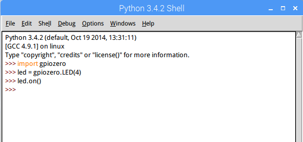 Pythonコンソールが開いたら、実際にスクリプトを入力してGPIOからLEDをコントロールしてみます。以下の写真のようにPythonのコードを入力します。