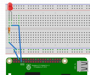 ラズベリーパイのGPIOポートからブレットボード上に抵抗とLEDを接続した回路を作り、LEDを点灯させます。今回はpythonのコンソールから直接コントロールする方法です。