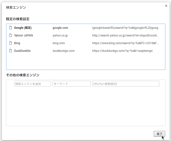 ”google(既定)”になったことを確認して、”完了”ボタンをクリックします。