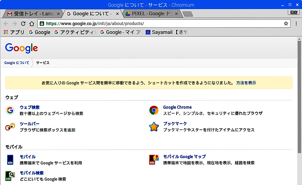 ”Google について”というページが開いたので、下の方にスクロールすると、