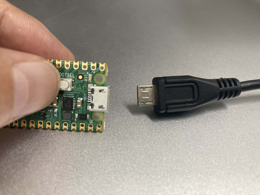 パソコン側にケーブルのUSB-A側を挿し、そのあとに、Pico Wの「BOOTSEL」ボタンを押しながらUSB micro-bを挿します。