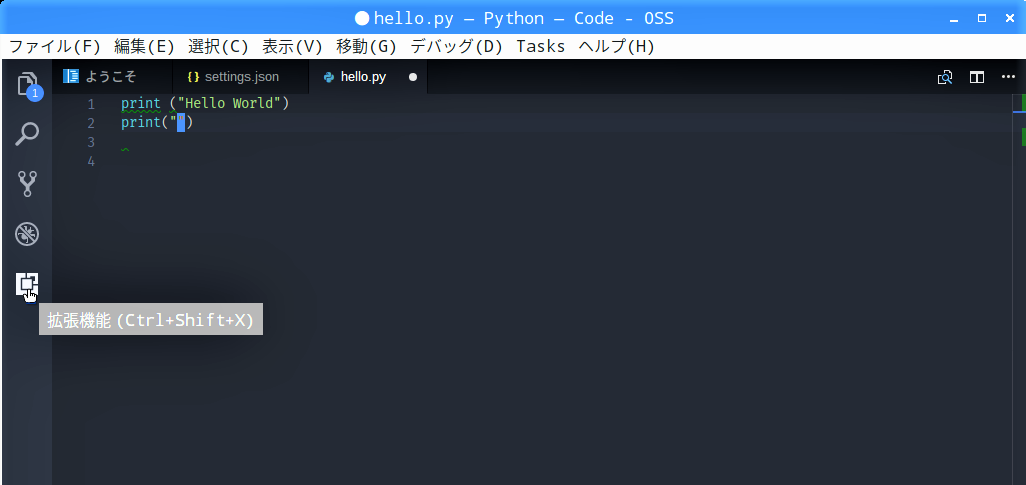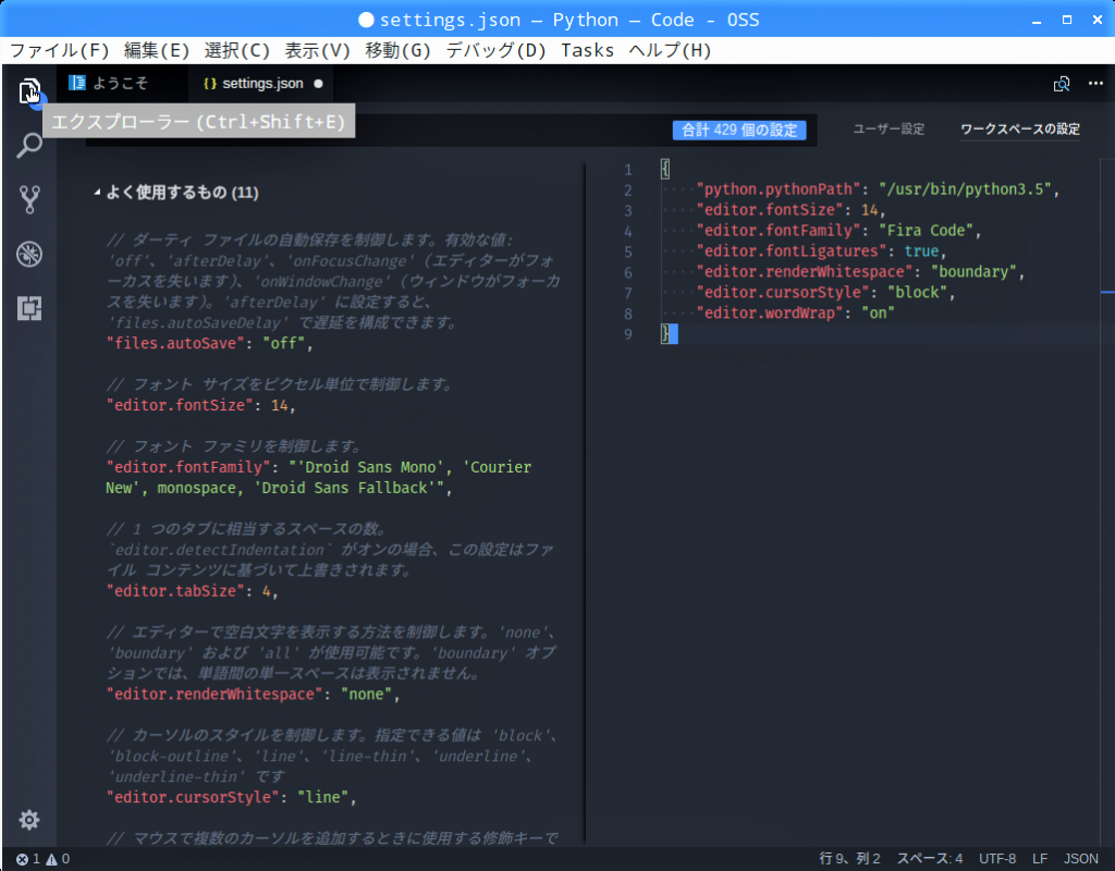 画面上のタブ”settings.json”をクリックしてからもう一度、アクティビティーバーの「エクスプローラー」アイコンをクリックしてサイドバーを閉じます。