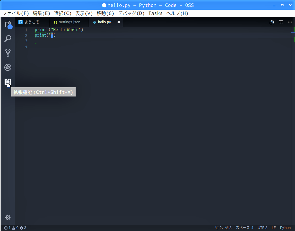 【 設定編 その1 】からの続きで、アクティビティーバーの「拡張機能」アイコンをクリックします。