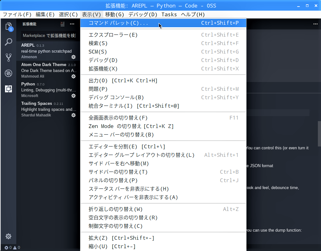 メニューバーから「表示」→「コマンドパレット」を選択します。