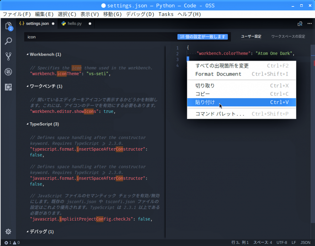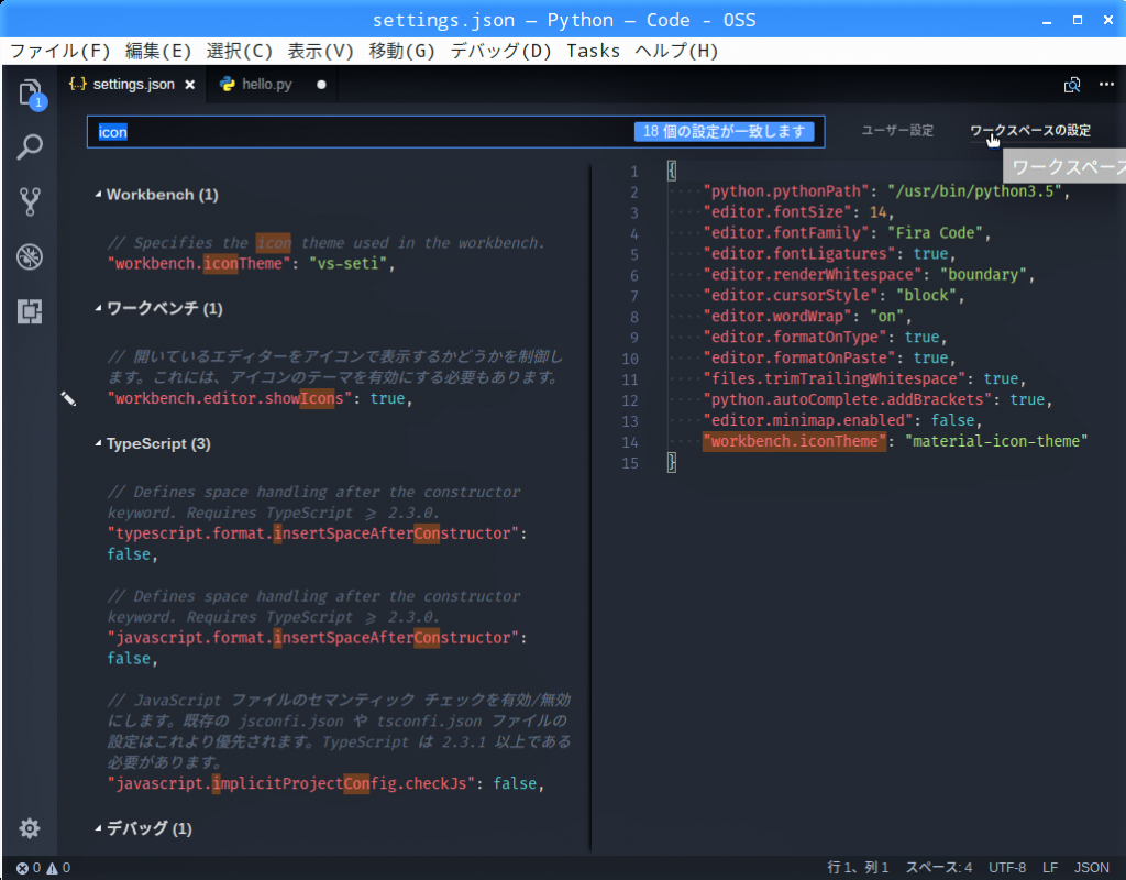 ワークスペースの設定をユーザー設定にコピーして編集する