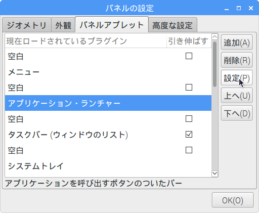 デスクトップ上のパネルで右クリックして現れる“パネルの設定”ウィンドウのタブ“パネルアプレット”では、パネルに表示される項目の追加/削除とレイアウトを設定できます。