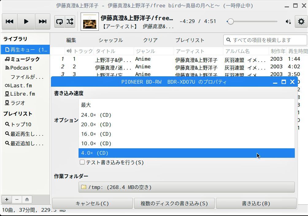 Rhythmboxに取り込まれたプレイリストから音楽CDを作成
